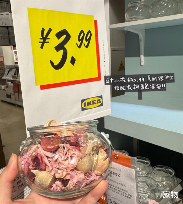 之前买过不少宜家的花瓶,但这小花瓶还是第一次见,它矮矮的像是个金鱼缸,里面最适合放些花瓣或干花,不仅能起到香薰的作用,同时当作摆设又很浪漫,最关键是,这么一个厚实的玻璃小花瓶,才三块多,真是绝了。
