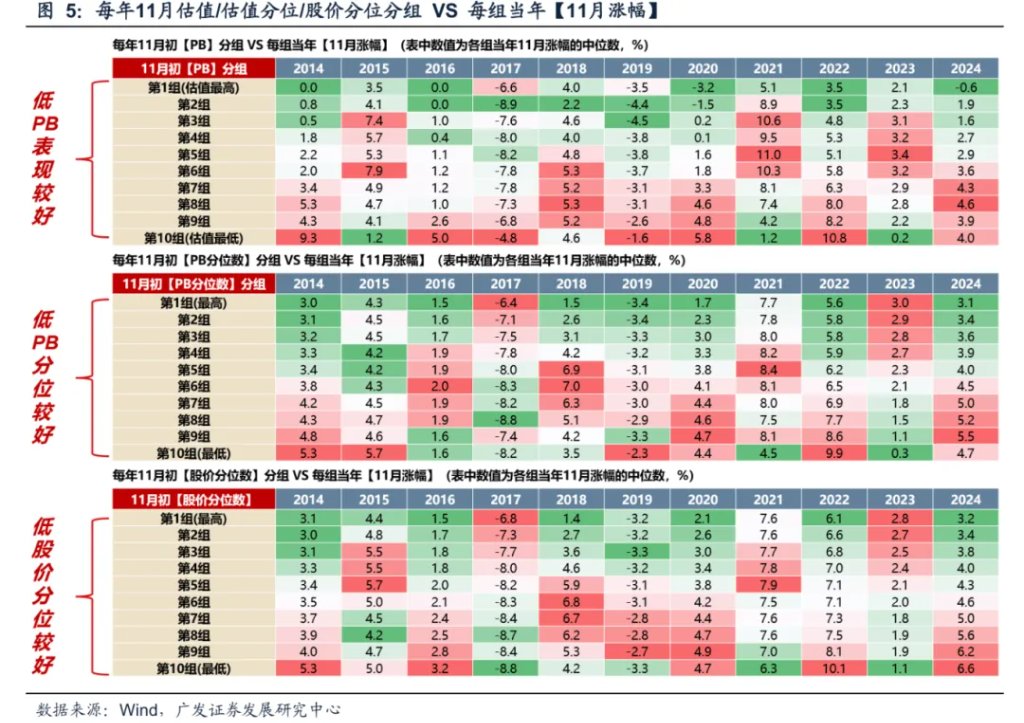 此外,11月开始,进入低估值有效性加强的阶段;低估值特征,通常持续到次年3月;期间除了2月(或春节后至两会前),均有一定低估值效应。