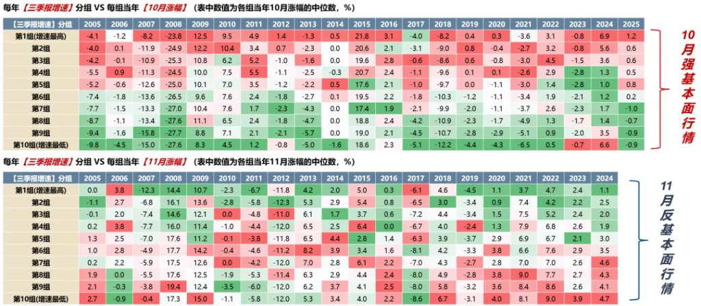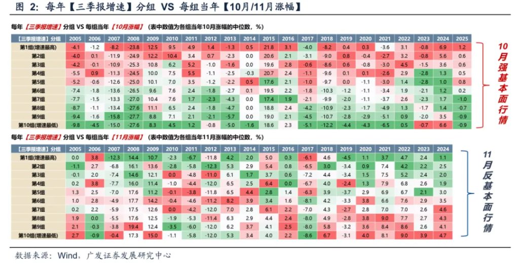 从过往各年份11月表现来看,当年三季度净利润增速很难做为市场涨跌有效参考指标,多数年份呈现负相关性。其中,很重要的原因是,10月份是业绩的强有效月份,市场在对基本面较充分的定价之后,有阶段兑现或修正的需求。