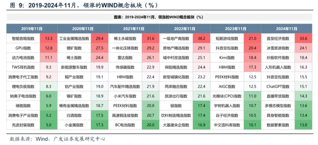 但11月的市场也并非简单防御,而是呈现比较明显的题材板块特征。比如2024年11月产业消息面催化的AI应用、机器人行情;2022年11月地产融资优化带来的地产链行情;2020年11月宏观数据持续改善驱动低估的周期板块走强;2019年5G建设、苹果无线耳机、新能源汽车规划也带动相关概念板块有不错的表现。