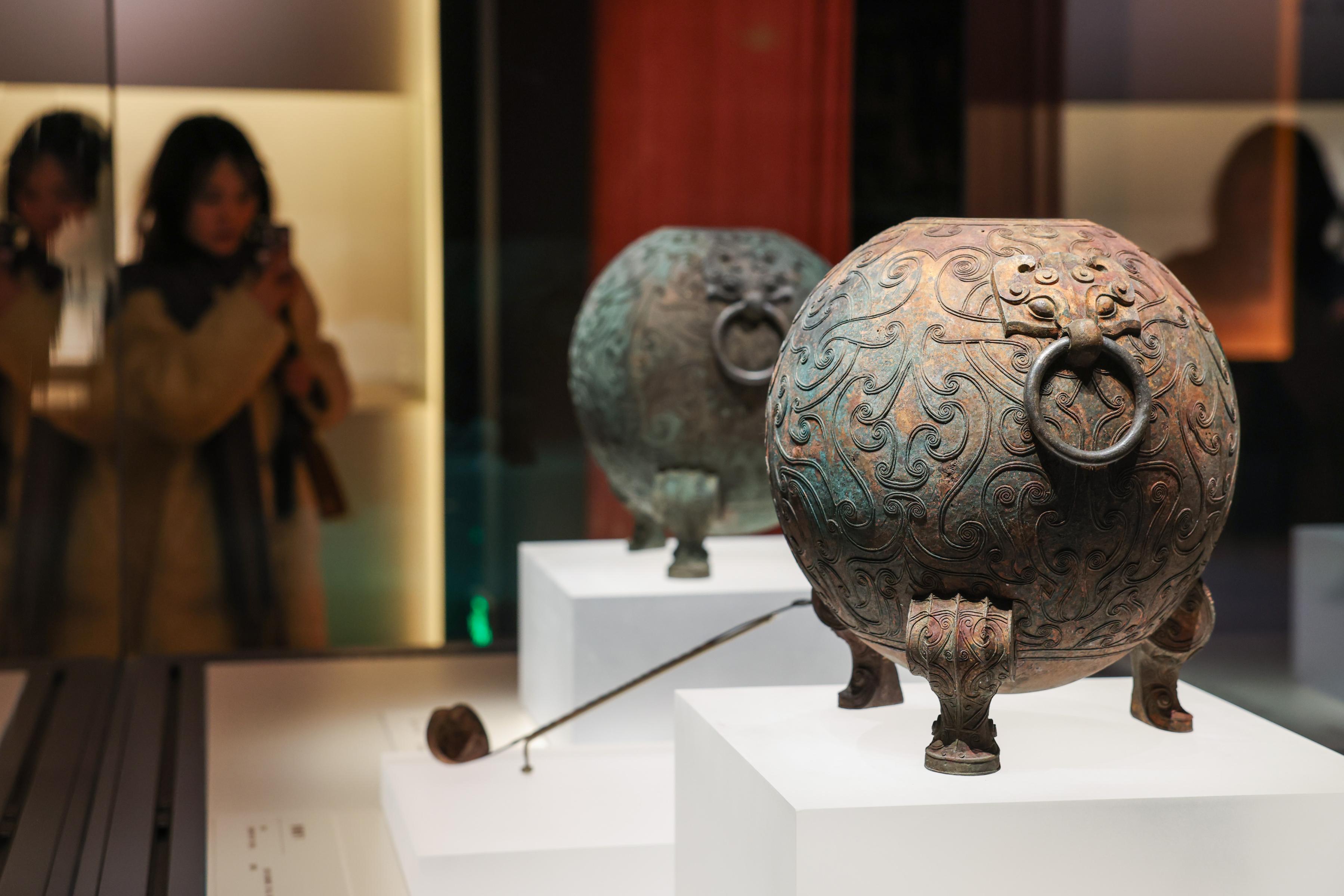 与众多名字里带生僻字的青铜器比,透雕纹饰环绕,颈部有一对兽面辅首衔环的球形青铜瓮因为是“首现”,只能以形定名。该器型以往鲜有发现,暂时没有类似升鼎、铜簋等“学名”。推测可能是盛放佳酿和汤羹的容器。