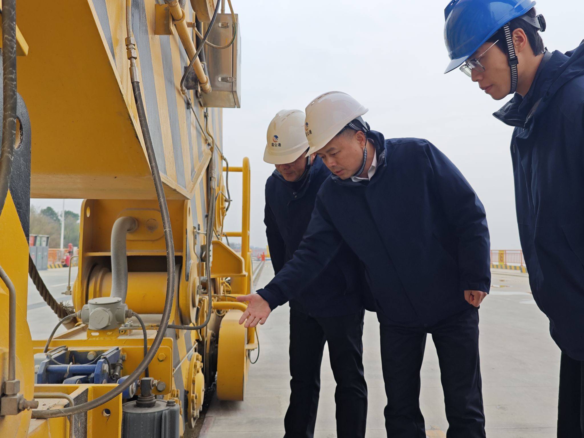 建设路上,挑战接踵而至。刚攻克技术难关,2024年汛期的超预期洪水便骤然来袭——工地被迫停工近一个月,工期压力陡然增大。“防汛不能有一丝松懈,施工也绝不能掉链子!”杨亮回忆,由于去年省内多地出现汛情,防汛转变成所有虞公港建设者的头等大事,彼时初具雏形的虞公港,还承担了一部分巩固堤防砂石建材转运管控的任务,但项目施工也不能落后,于是他带领团队一起开启了双线作战:一边保障巩固堤防的砂石建材转运、管控,守好防汛底线;一边抢回延误工期,推进项目建设。