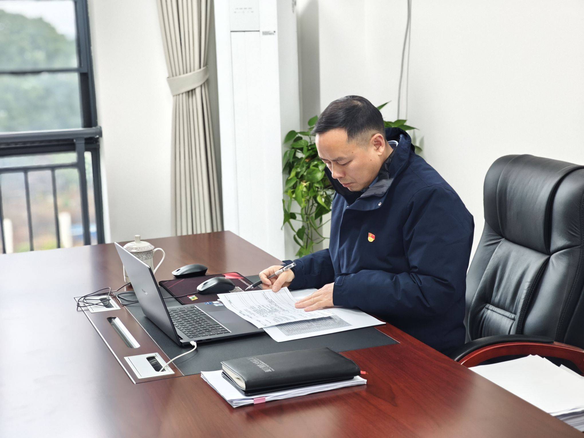 △杨亮正在办公。图/记者彭皓泽